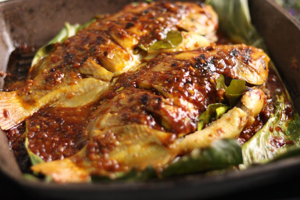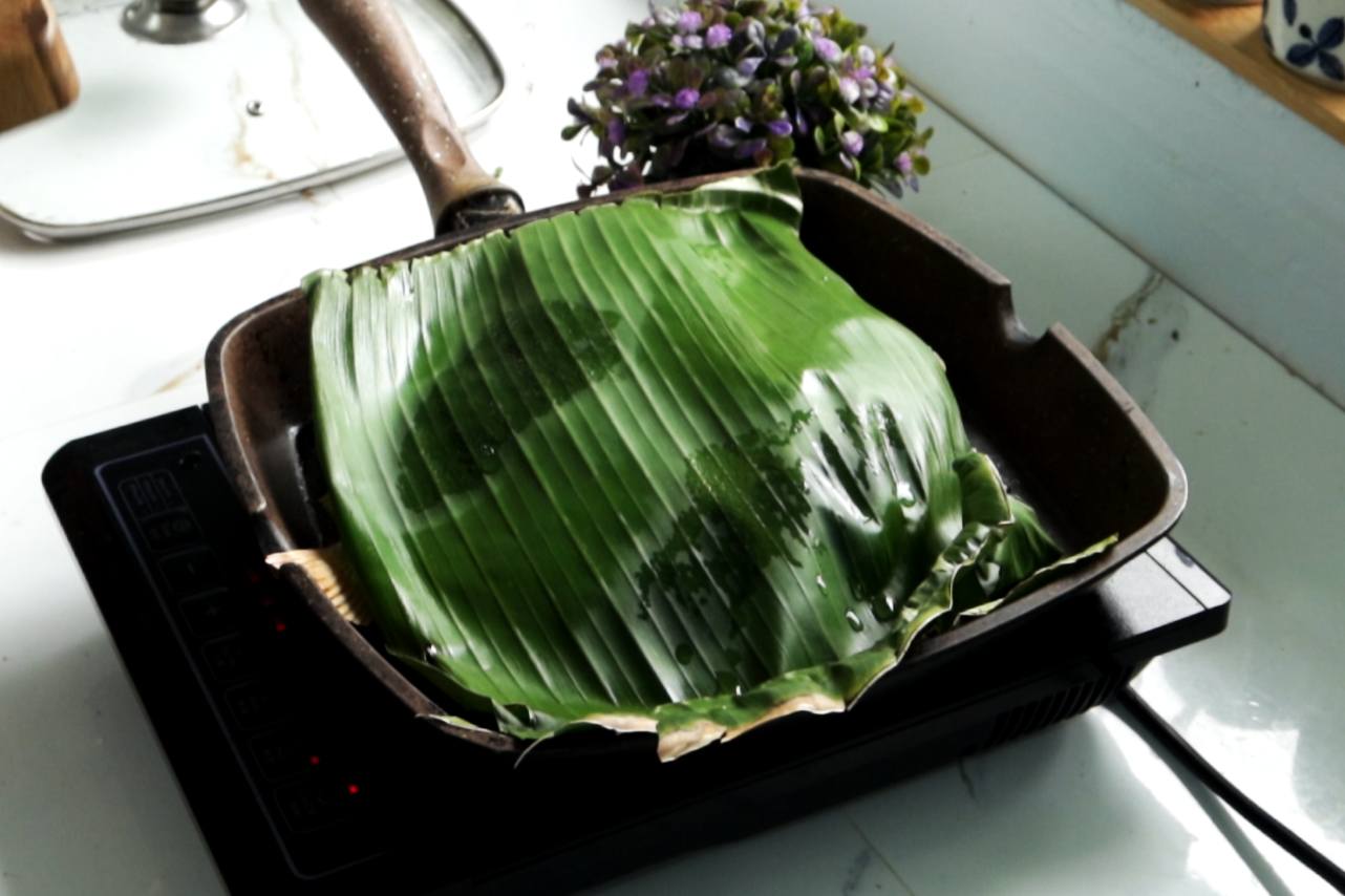 Lapikkan daun pisang di atas kuali grill, dan sapukan sos ikan bakar jimbaran yang telah dimasak tadi.